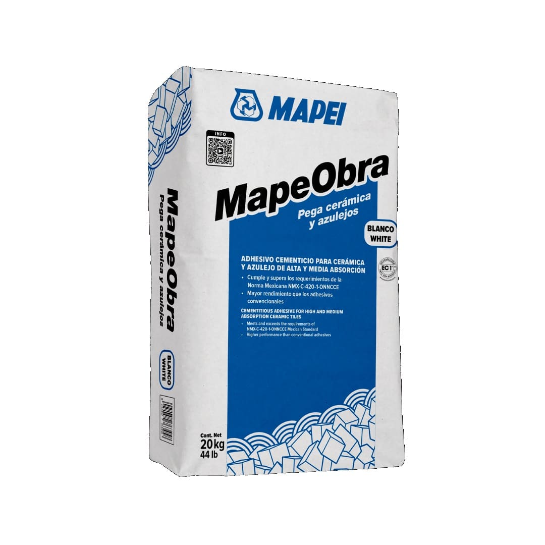MapeObra Pega Cerámica y Azulejos en color gris o blanco, está compuesto de cemento, arena de granulometría seleccionada y aditivos especiales según una fórmula desarrollada en los Laboratorios de Investigación y Desarrollo de MAPEI.